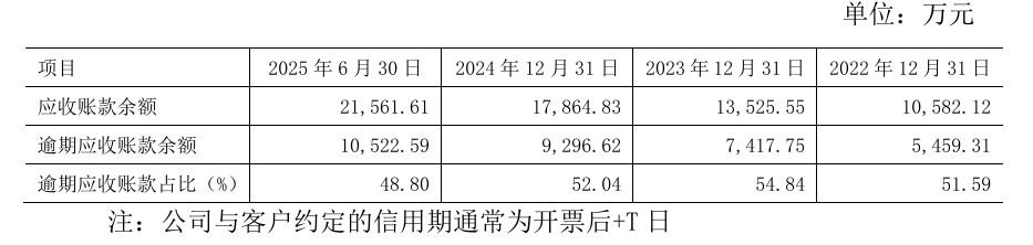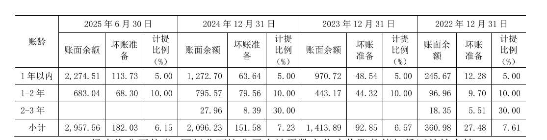 从规模来看,公司应收账款呈持续扩张态势:2022年末为1.1亿元,2023年末增至1.4亿元,2024年末攀升至1.8亿元,截至2025年6月底进一步突破2.2亿元,两年半内规模翻番有余。