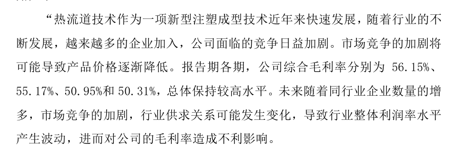 但技术溢价的可持续性,正面临行业竞争与价格下行的双重考验。作为核心盈利来源,热流道系统产品单价近年来持续走低:汽车内外饰热流道系统平均单价从2022年的5334元/点降至2025年上半年的4584元/点,降幅达14%;即便定位更高端的汽车车灯类产品,单价也从8660元/点微降至8524元/点,增长动力趋缓。单价下行直接传导至盈利端,导致毛利率累计缩水近6个百分点。