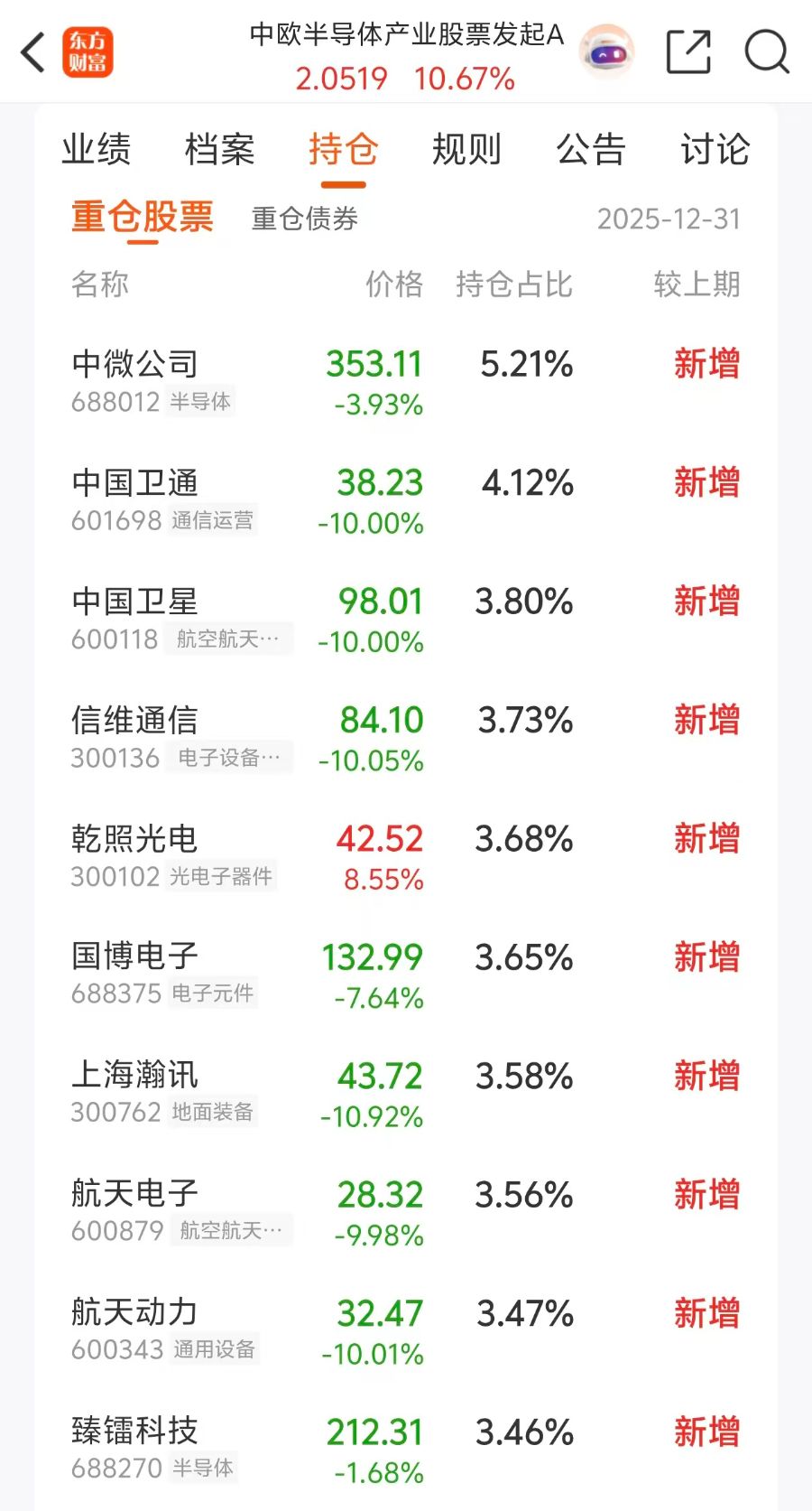 结果一看年末持仓,第一大重仓行业是航天装备,前十大重仓股好多商业航天的熟悉的名字。 不知道今天商业航天这种跌法,中欧半导体要回调多少个点。