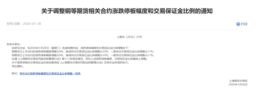 自2026年1月28日(星期三)收盘结算时起,铜期货已上市合约的涨跌停板幅度调整为9%,套保持仓交易保证金比例调整为10%,一般持仓交易保证金比例调整为11%;铝期货已上市合约的涨跌停板幅度调整为9%,套保持仓交易保证金比例调整为10%,一般持仓交易保证金比例调整为11%。