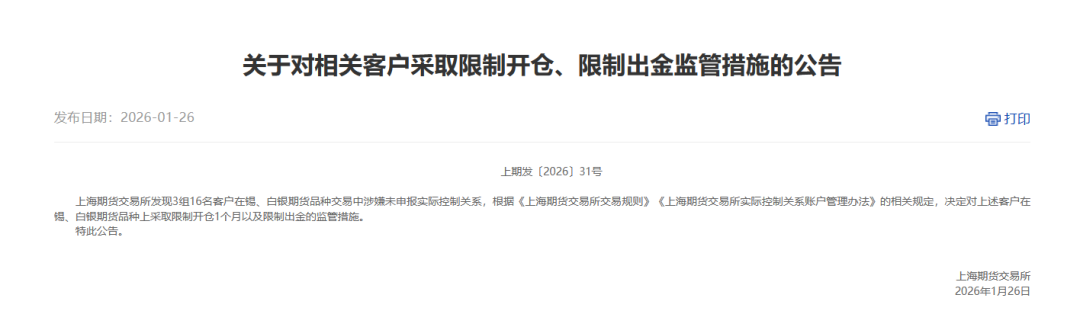 当日中午,上期所公告称,发现3组16名客户在锡、白银期货品种交易中涉嫌未申报实际控制关系,根据相关规定,决定对上述客户在锡、白银期货品种上采取限制开仓1个月以及限制出金的监管措施。