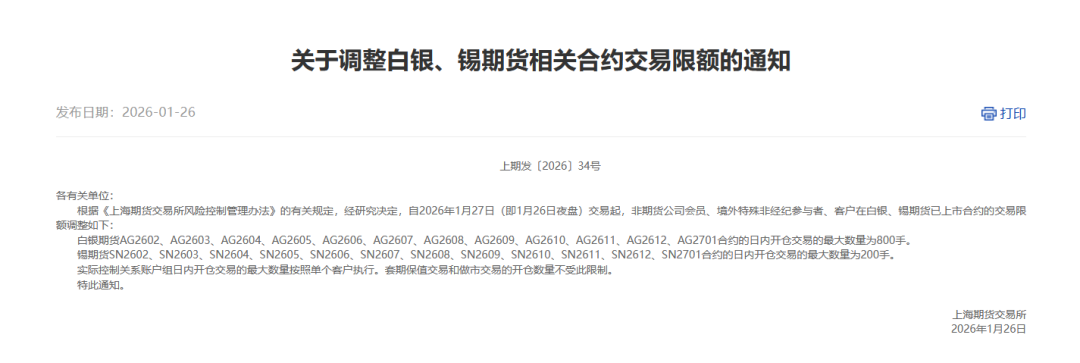 自2026年1月27日(即1月26日夜盘)交易起,非期货公司会员、境外特殊非经纪参与者、客户在白银、锡期货已上市合约的交易限额调整为: 白银期货AG2602、AG2603、AG2604、AG2605、AG2606、AG2607、AG2608、AG2609、AG2610、AG2611、AG2612、AG2701合约的日内开仓交易的最大数量为800手。 锡期货SN2602、SN2603、SN2604、SN2605、SN2606、SN2607、SN2608、SN2609、SN2610、SN2611、SN2612、SN2701合约的日内开仓交易的最大数量为200手。