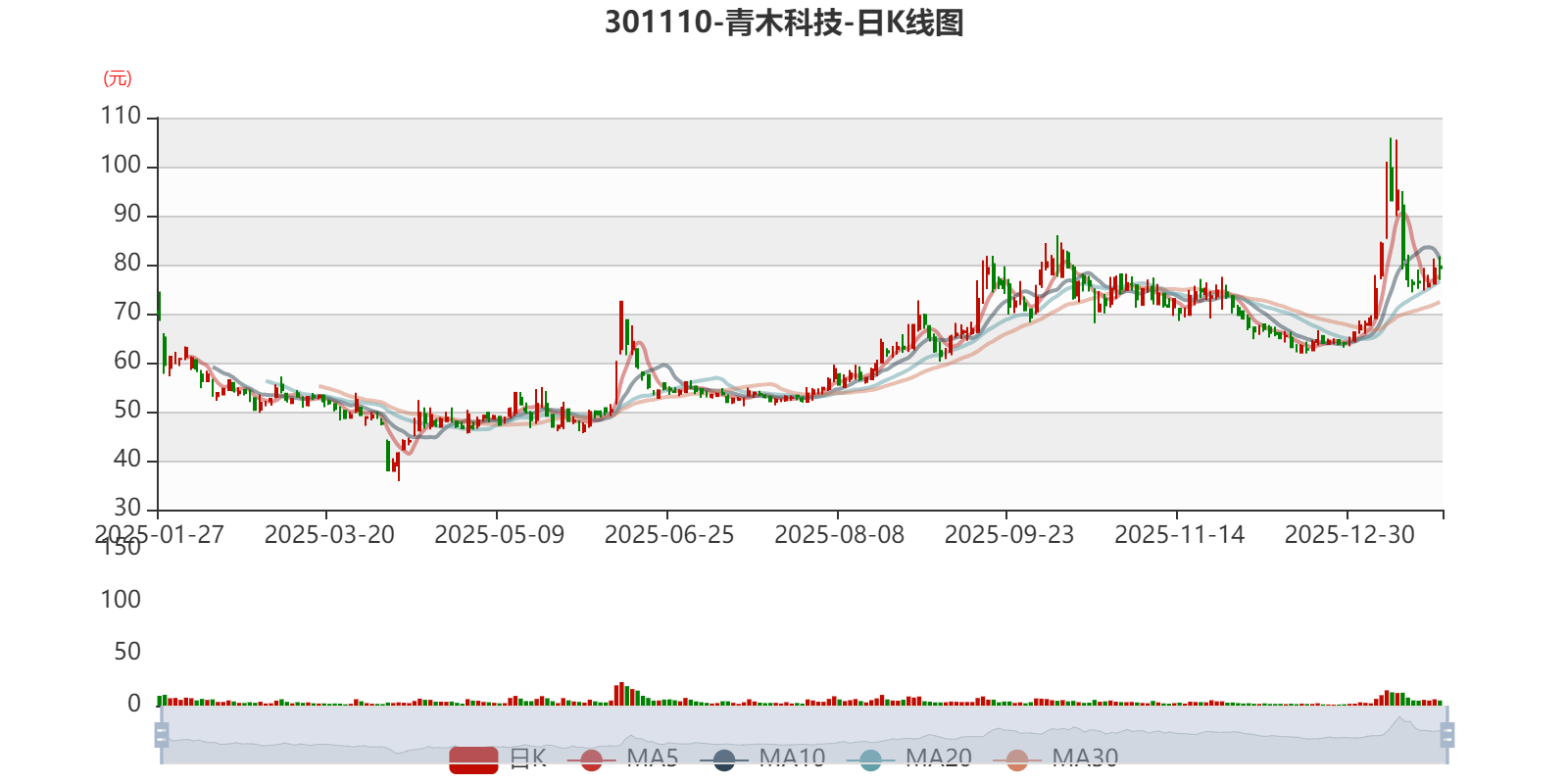 中证智能财讯青木科技(301110)1月26日晚间披露2025年度业绩预告,预计2025年归母净利润1.18亿元至1.36亿元,同比增长30%-50%;扣非净利润预计1.02亿元至1.17亿元,同比增长30%-50%。以1月26日收盘价计算,青木科技目前市盈率(TTM)约为54.02倍-62.33倍,市净率(LF)约5.03倍,市销率(TTM)约5.37倍。