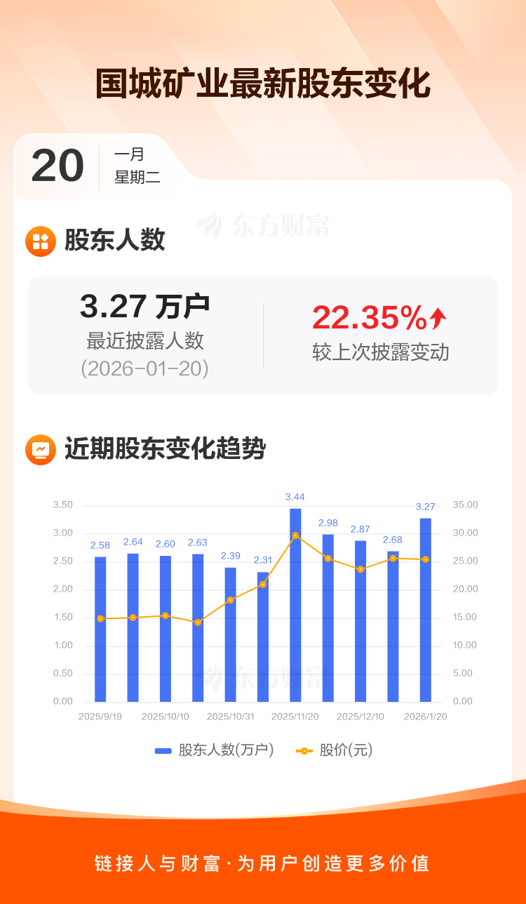 国城矿业:截至1月20日最新股东户数3.27万户,较上期增加22.35%
