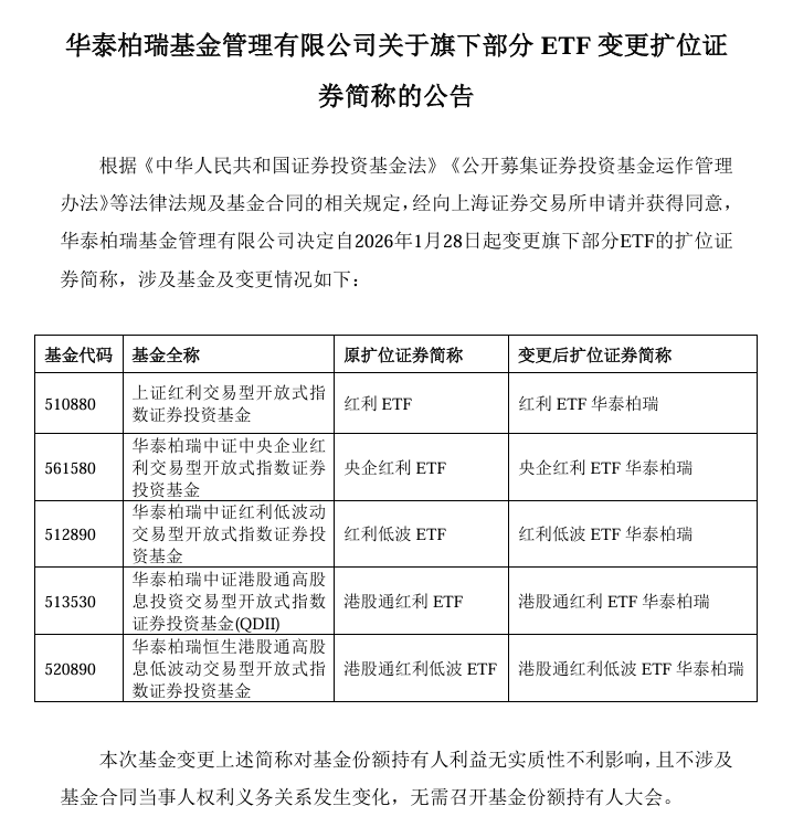 1月26日晚间,华泰柏瑞基金发布公告称,自1月28日起,公司旗下的红利ETF、央企红利ETF、红利低波ETF、港股通红利ETF、港股通红利低波ETF将变更场内简称,集体加上“华泰柏瑞”后缀,即变更为红利ETF华泰柏瑞、央企红利ETF华泰柏瑞、红利低波ETF华泰柏瑞、港股通红利ETF华泰柏瑞 、港股通红利低波ETF华泰柏瑞。