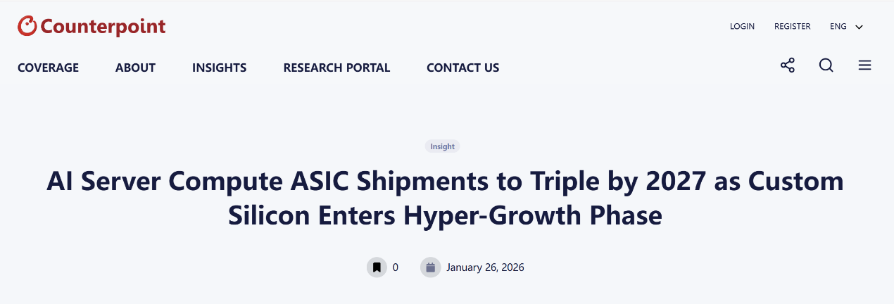 上证报中国证券网讯1月26日,Counterpoint发布报告称,全球AI服务器ASIC阵营在近期将经历高速增长,到2027年出货数量将达到2024年的三倍,2028年则有望以1500余万颗的规模反超GPU。