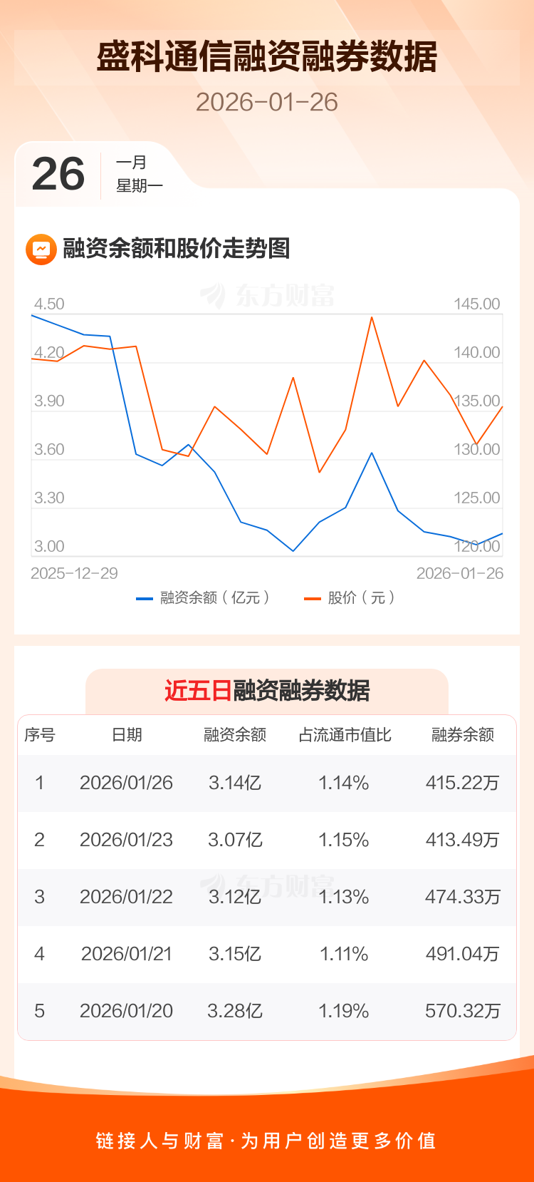 交易所最新数据显示,盛科通信于2026年1月26日获融资买入5103.76万元,融资偿还4351.18万元,当日融资净买入752.59万元。目前,该股融资余额3.14亿,占流通市值比例为1.14%。