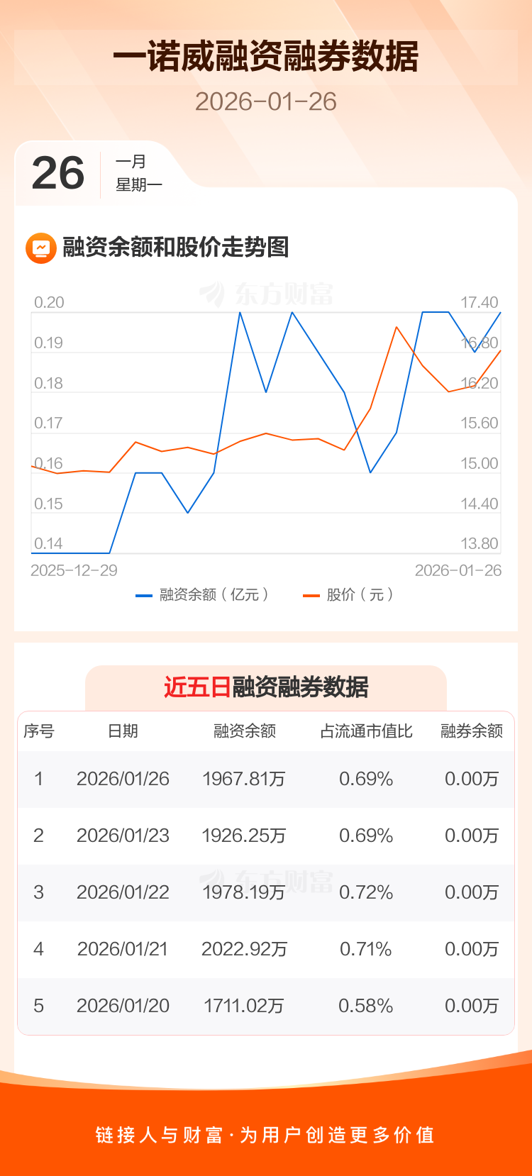 交易所最新数据显示,一诺威于2026年1月26日获融资买入642.15万元,融资偿还600.59万元,当日融资净买入41.56万元。目前,该股融资余额1967.81万,占流通市值比例为0.69%。
