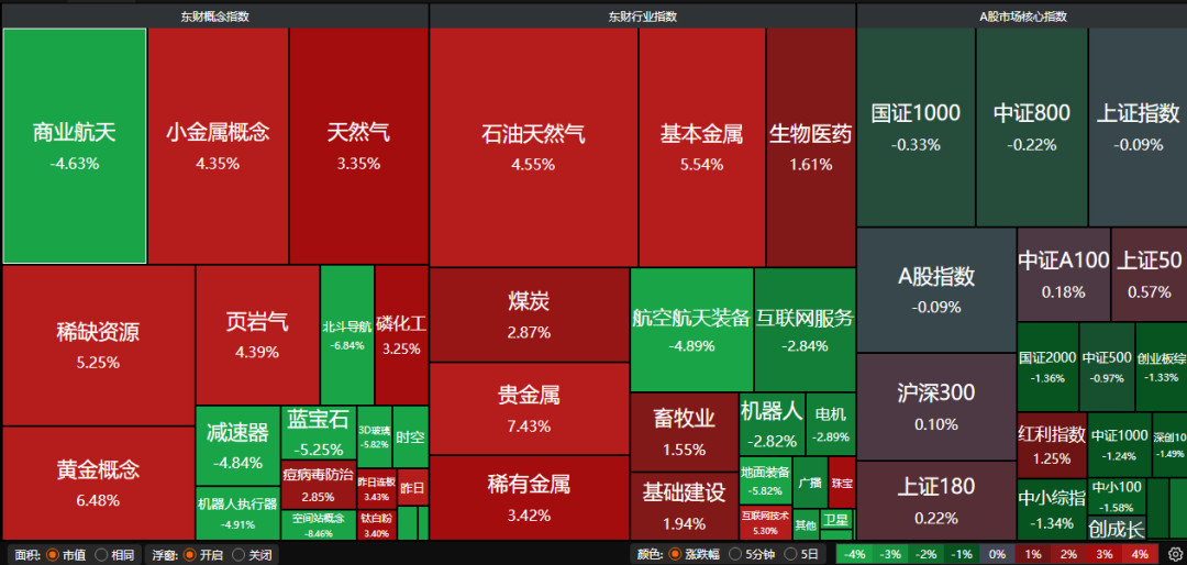 A股三大指数昨日集体收跌,沪指跌0.09%,深证成指跌0.85%,创业板指跌0.91%。沪深京三市成交额达到32810亿。行业板块涨少跌多,贵金属、采掘行业、珠宝首饰、小金属板块涨幅居前,航天航空、计算机设备、电子化学品、半导体、通信设备板块跌幅居前。