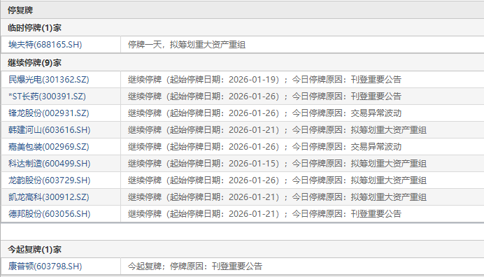 1月27日盘前停复牌汇总