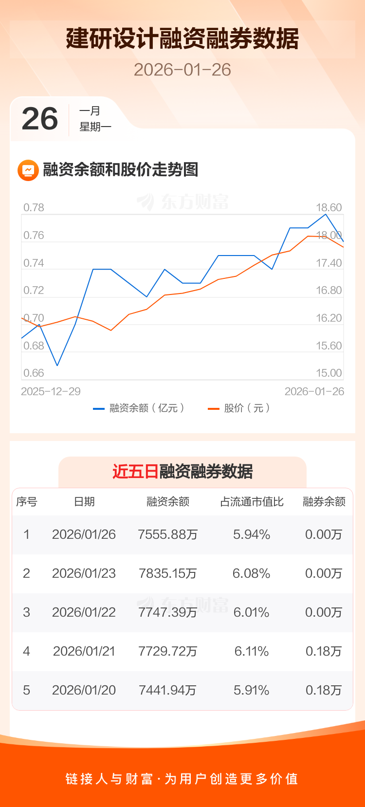 交易所最新数据显示,建研设计于2026年1月26日获融资买入262.68万元,融资偿还541.95万元,当日融资净偿还279.27万元。目前,该股融资余额7555.88万,占流通市值比例为5.94%。