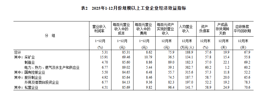 2025年末,规模以上工业企业每百元资产实现的营业收入为75.9元,比上年末减少2.7元;人均营业收入为188.9万元,比上年末增加5.5万元;产成品存货周转天数为19.9天,比上年末增加0.6天;应收账款平均回收期为67.9天,比上年末增加3.6天。