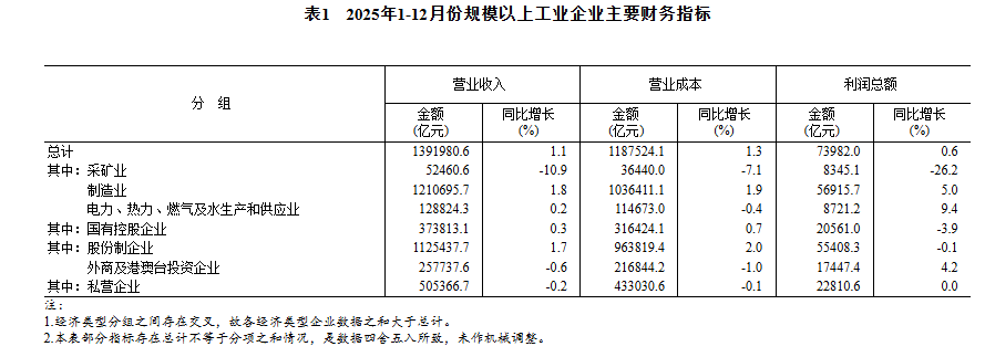【大河财立方消息】2026年1月27日,国家统计局发布2025年全国规模以上工业企业利润情况。数据显示,2025年,全国规模以上工业企业实现利润总额73982.0亿元,比上年增长0.6%(按可比口径计算)。