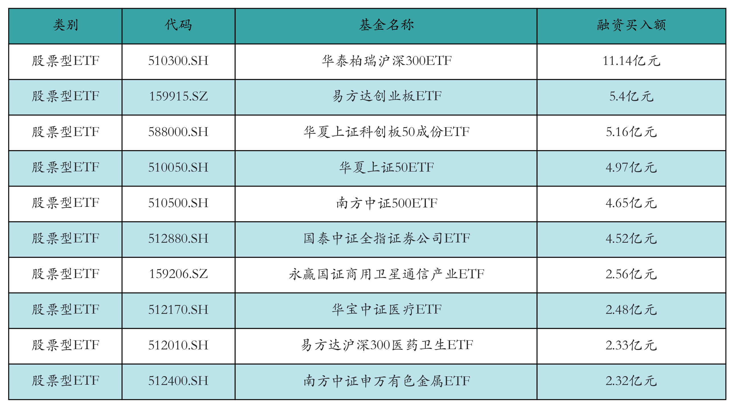 昨日股票型ETF融资买入额最高的3只ETF及其买入金额分别为:华泰柏瑞沪深300ETF(11.14亿元)、易方达创业板ETF(5.4亿元)、华夏上证科创板50成份ETF(5.16亿元)。融资买入额前10详情见下表: