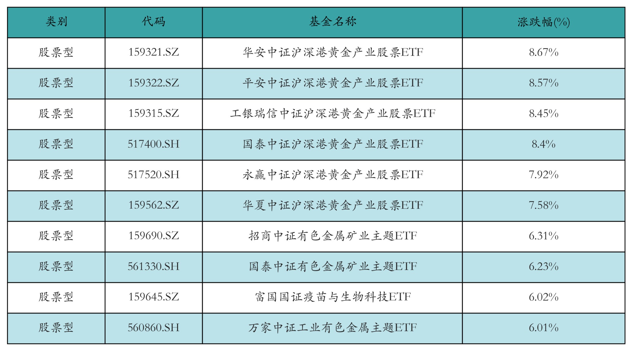 昨日股票型ETF涨幅最高的3只ETF及其收益率分别为:华安中证沪深港黄金产业股票ETF(8.67%)、平安中证沪深港黄金产业股票ETF(8.57%)、工银瑞信中证沪深港黄金产业股票ETF(8.45%)。涨幅前10详情见下表: