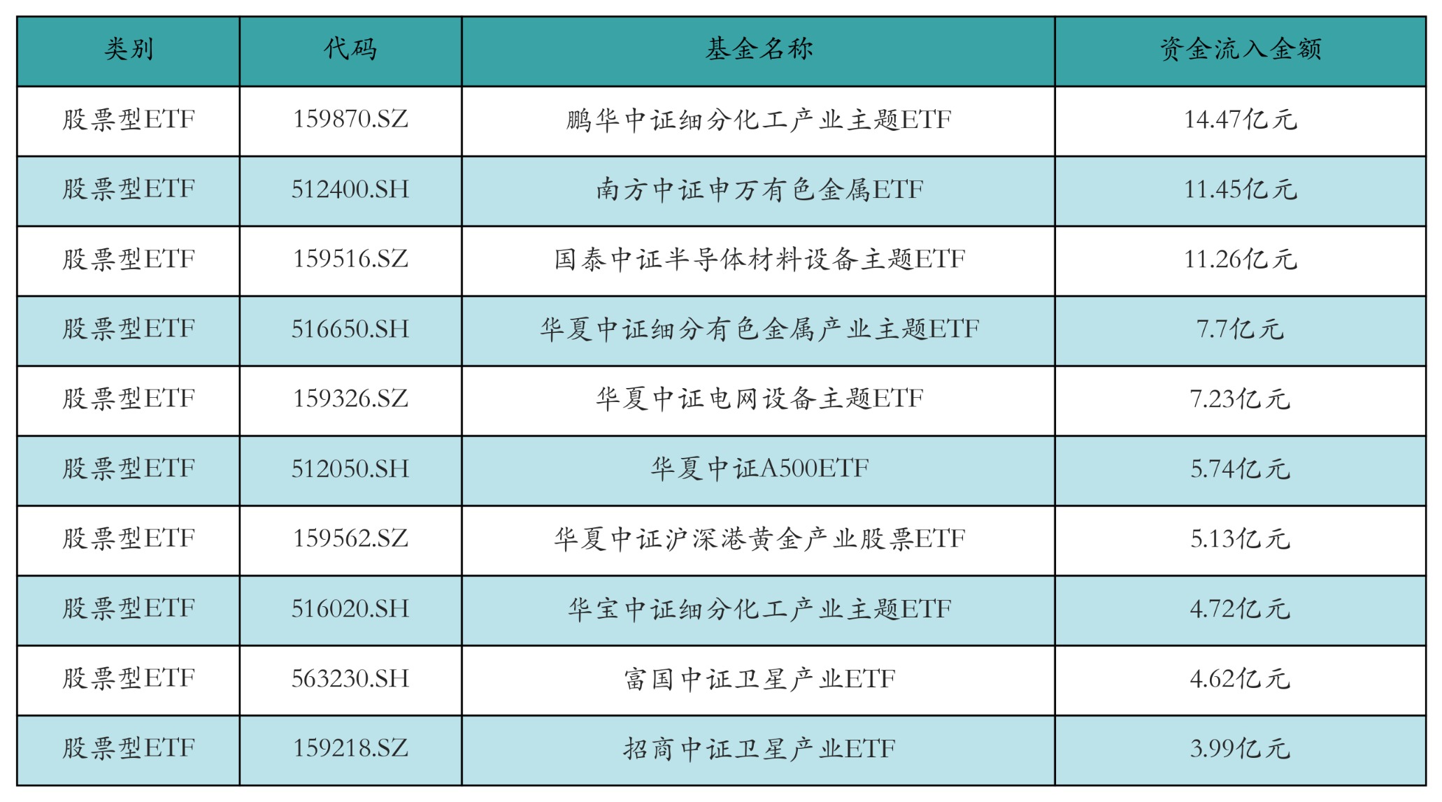昨日股票型ETF资金流入最多的3只ETF及其流入金额分别为:鹏华中证细分化工产业主题ETF(流入14.47亿元)、南方中证申万有色金属ETF(流入11.45亿元)、国泰中证半导体材料设备主题ETF(流入11.26亿元)。资金流入前10详情见下表: