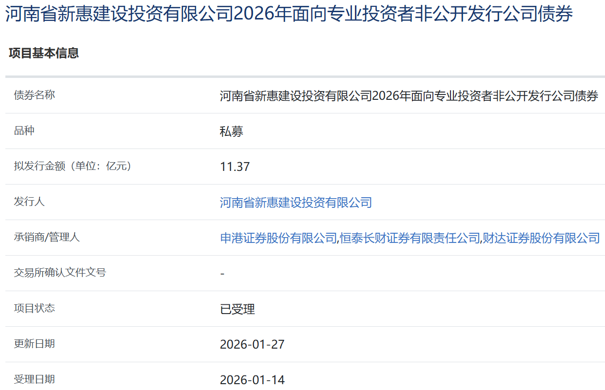 【大河财立方消息】1月27日消息,河南省新惠建设投资有限公司2026年面向专业投资者非公开发行公司债券项目获上交所受理。本期债券拟发行金额11.37亿元,承销商/管理人为申港证券、恒泰长财证券、财达证券。