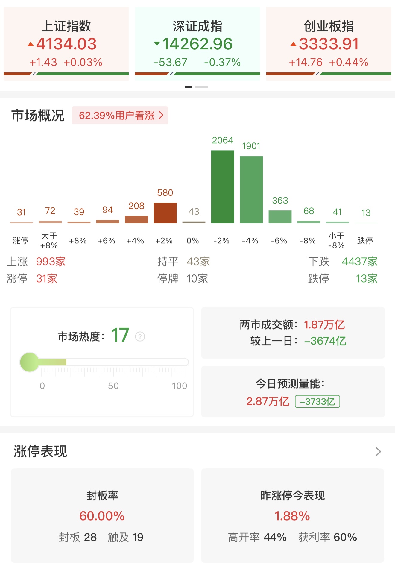 午评:创业板指探底回升涨0.44% 全市场超4400只个股下跌