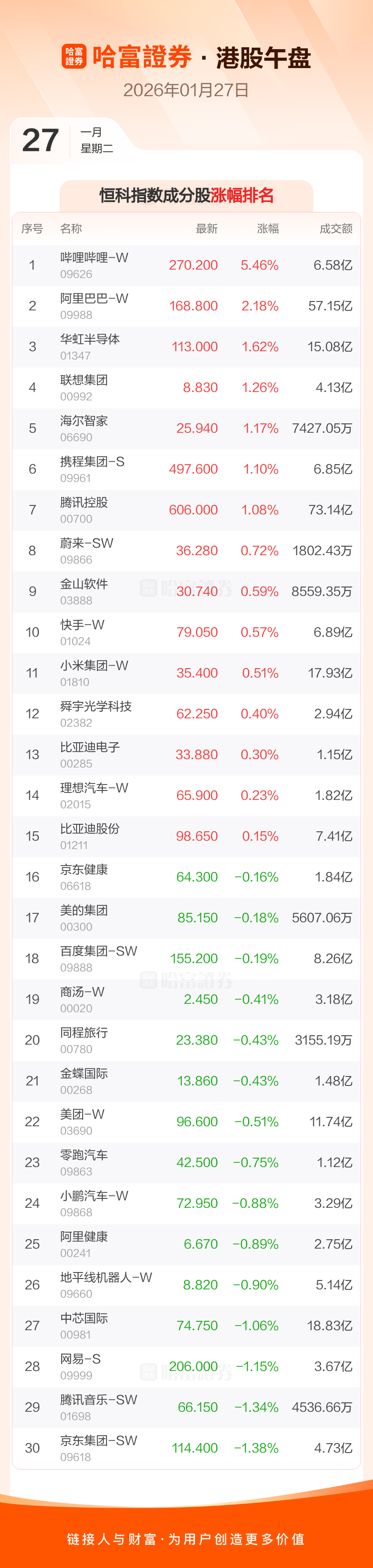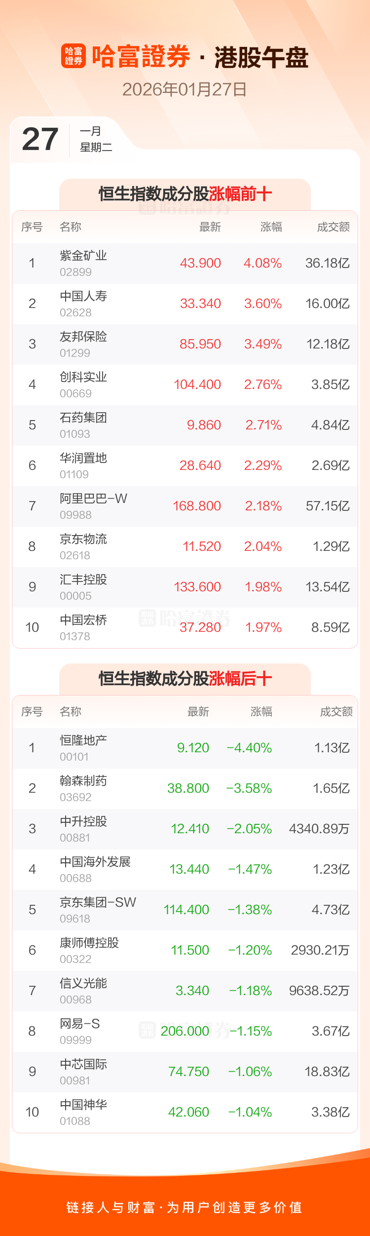 港股1月27日午盘走高,恒生指数收报27055.65点,涨290.13点,涨幅1.08%;恒生科技指数收报5737.22点,涨11.23点,涨幅0.2%。恒生指数成分股中紫金矿业、中国人寿、友邦保险涨幅居前,恒隆地产、翰森制药、中升控股跌幅靠前。恒生科技指数成分股中哔哩哔哩-W、阿里巴巴-W、华虹半导体涨幅居前,京东集团-SW、腾讯音乐-SW、网易-S跌幅靠前。