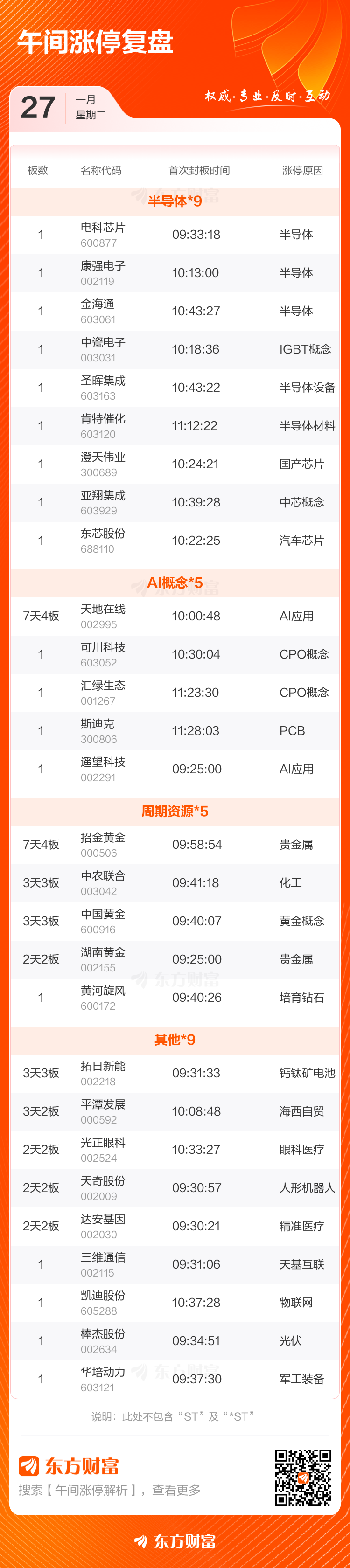 1月27日午间涨停复盘:31股涨停 电科芯片今日首板