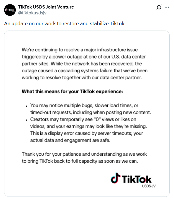 TikTok美国数据安全合资公司通报系统故障:数据中心断电导致 正努力修复