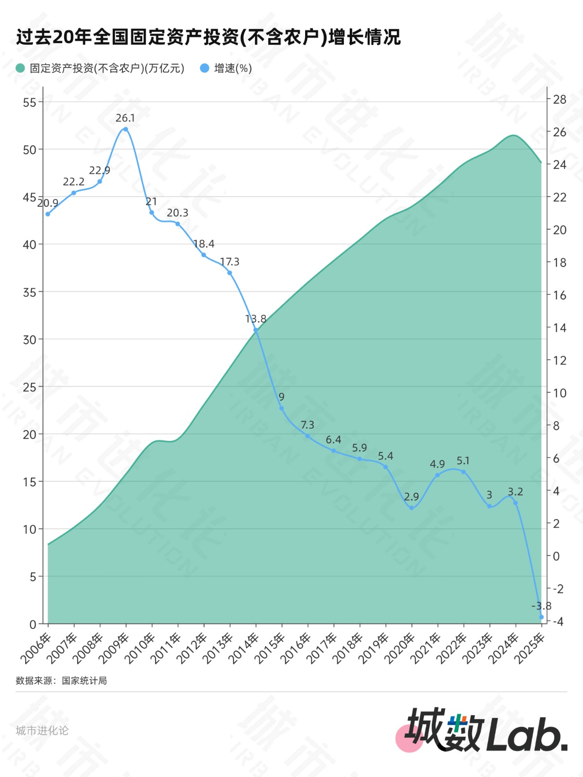2025年,全国固定资产投资485186亿元,比上年下降3.8%。事实上,早在去年前11个月全国经济数据发布时,就有媒体分析数据称,按照月度趋势,2025年固投增速预计将为负值。这是过去二十年固投首次出现同比负增长的情况。