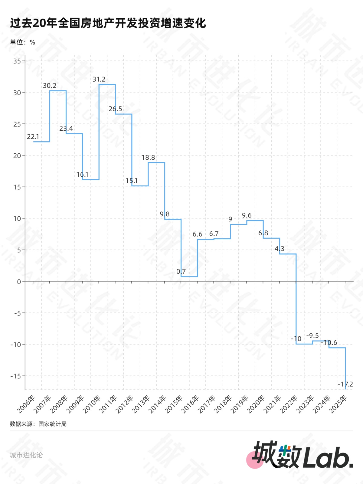 投资下跌的一大核心原因是房地产开发投资的大幅负增长。2025年,全国房地产开发投资下降17.2%;若扣除房地产开发投资,全国固定资产投资收窄至0.5%。此外,去年我国基础设施投资也出现了2.2%的下降。