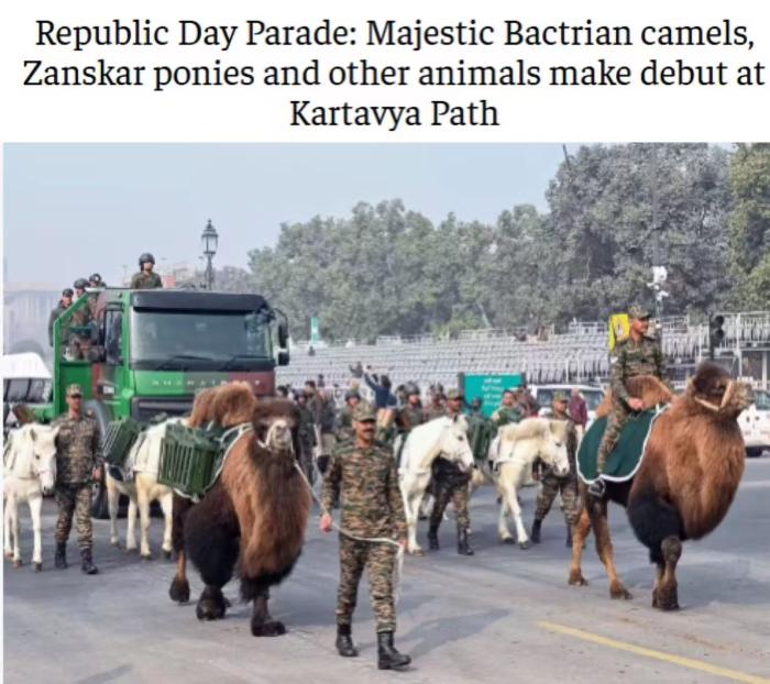 据报道,方队包括双峰骆驼、赞斯卡矮种马、猛禽、印度本土品种军犬等动物。