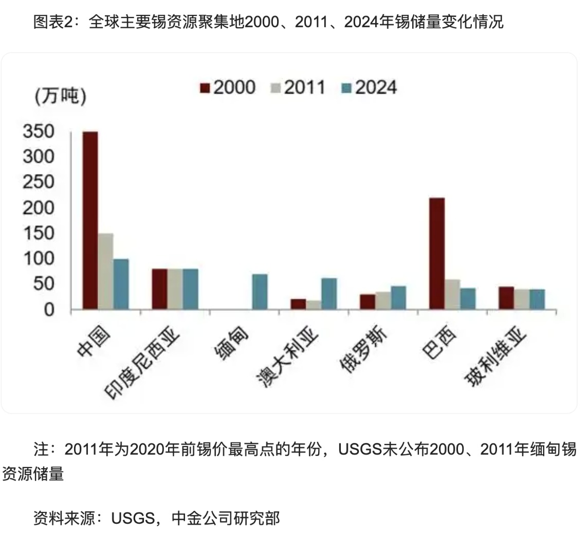 中国是全球最大的锡资源储量国和产量国。从全球资源格局看,锡资源主要分布在中国、印度尼西亚、巴西、玻利维亚、澳大利亚,五国锡储量超过全球总储量的70%。