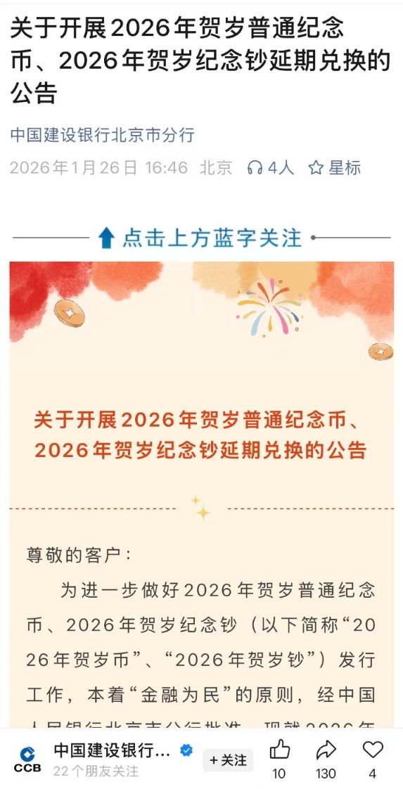 2026 年马年新春临近,北京、深圳、内蒙古、山西、黑龙江等多地的工商银行、建设银行、交通银行等承办银行陆续发布公告,宣布延长 2026 年贺岁纪念币、纪念钞兑换期限,明确延期细节与兑换规则,全力保障公众兑换权益。此次延期主要针对全国统一集中兑换期结束后,部分已预约成功但未完成兑换的币钞。