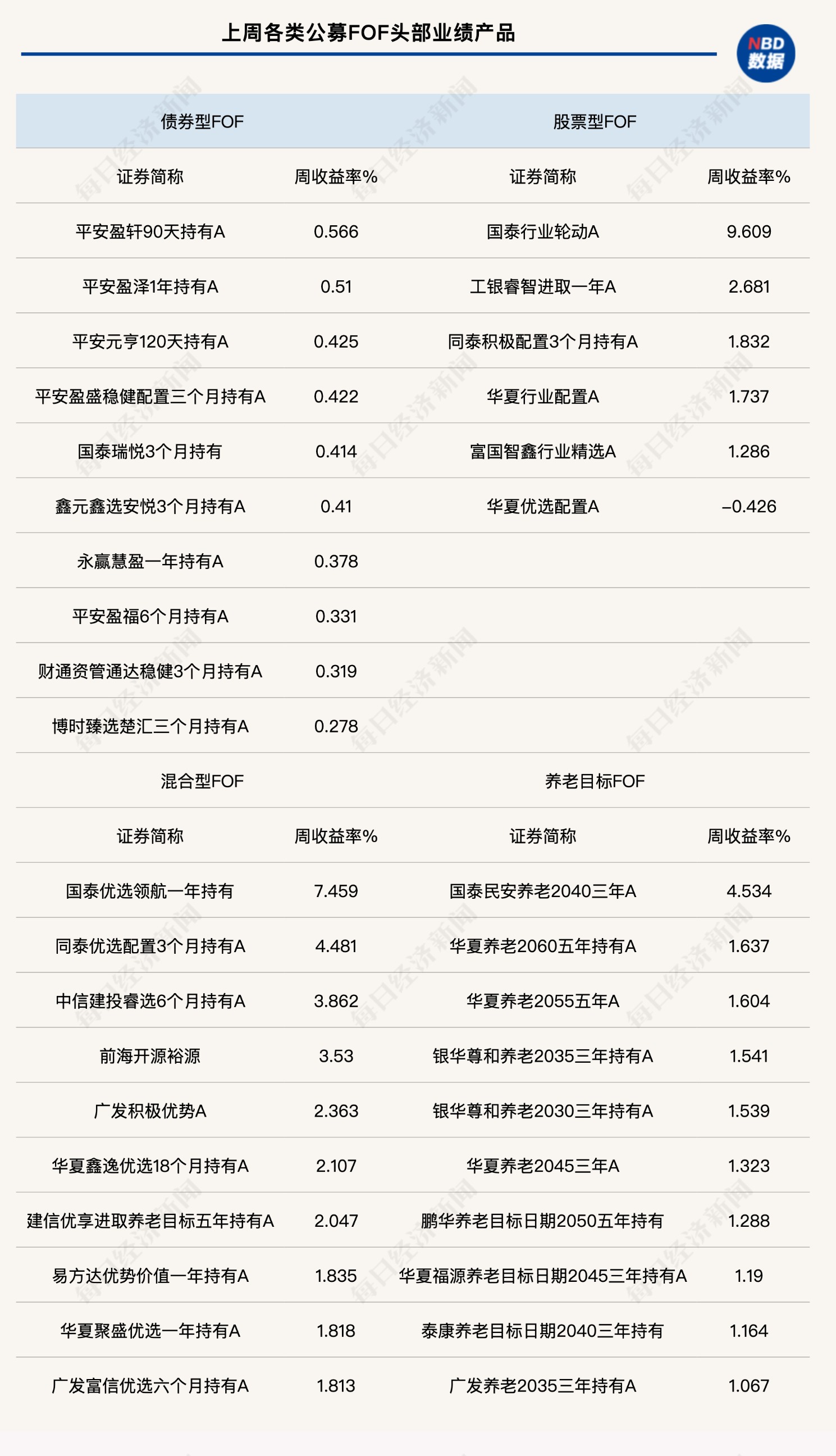 最后,简单盘点一下上周各类公募FOF的表现,股票型FOF中,上周收益最高的为国泰行业轮动A,单周上涨9.61%;混合型FOF中,上周收益最高的为国泰优选领航一年持有,单周上涨7.46%。