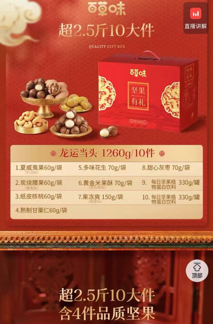 1月26日,界面新闻记者查询百草味官方旗舰店,首页有多款年货坚果礼盒在售,价格在三十元左右到上百元不等,并有优惠补贴价,首页还有“百草味年货坚果礼盒累计销售超1.6亿件”“连续8年全网销售领先”的宣传字样。