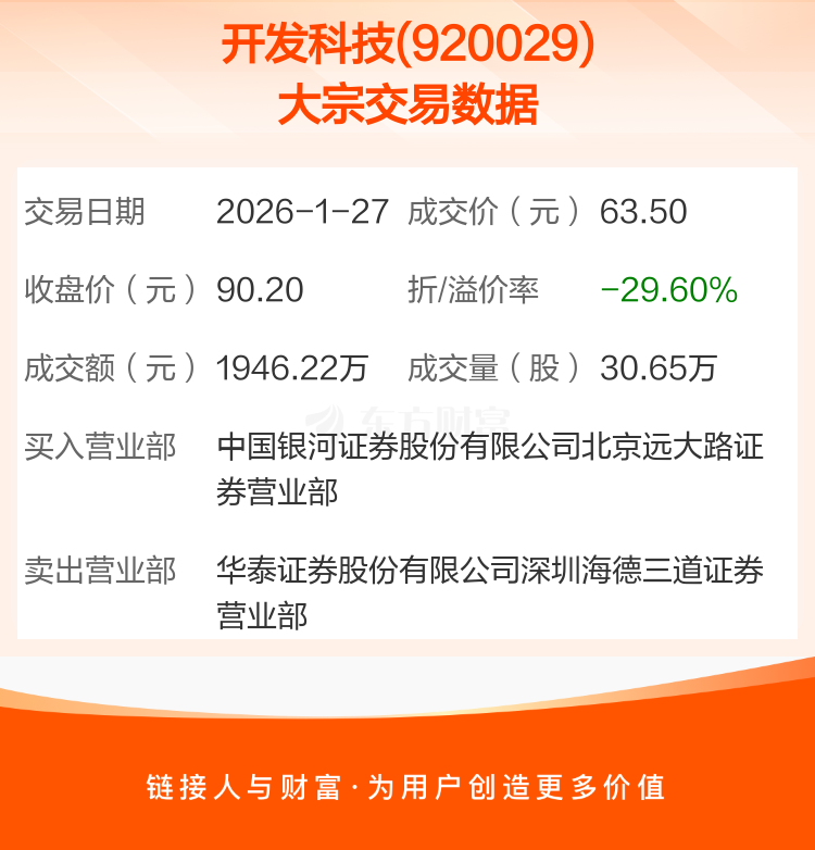 大宗交易:开发科技成交1946.22万元,折价29.60%(1-27)