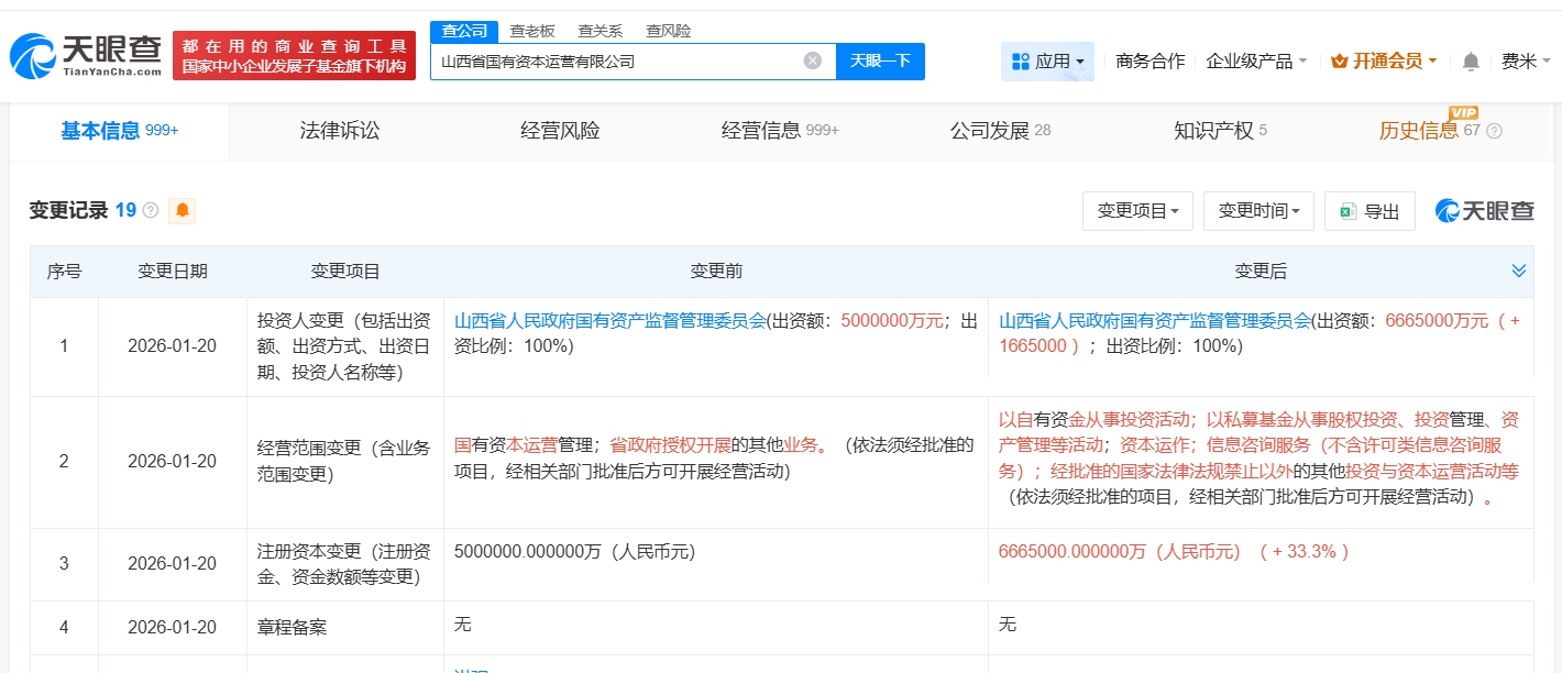 南方财经1月27日电,天眼查App显示,近日,山西省国有资本运营有限公司发生工商变更,注册资本由500亿人民币增至666.5亿人民币,增幅33.3%。该公司成立于2017年7月,法定代表人为洪强,经营范围包括以自有资金从事投资活动、资本运作、信息咨询服务等,由山西省人民政府国有资产监督管理委员会全资持股。