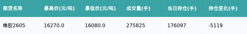 南财智讯1月27日电,盘后期货数据显示,上海期货交易所的橡胶主力合约收跌0.31%,收盘报16205.0元/吨,日内资金流出1.57亿元。其他相关指标见下表: