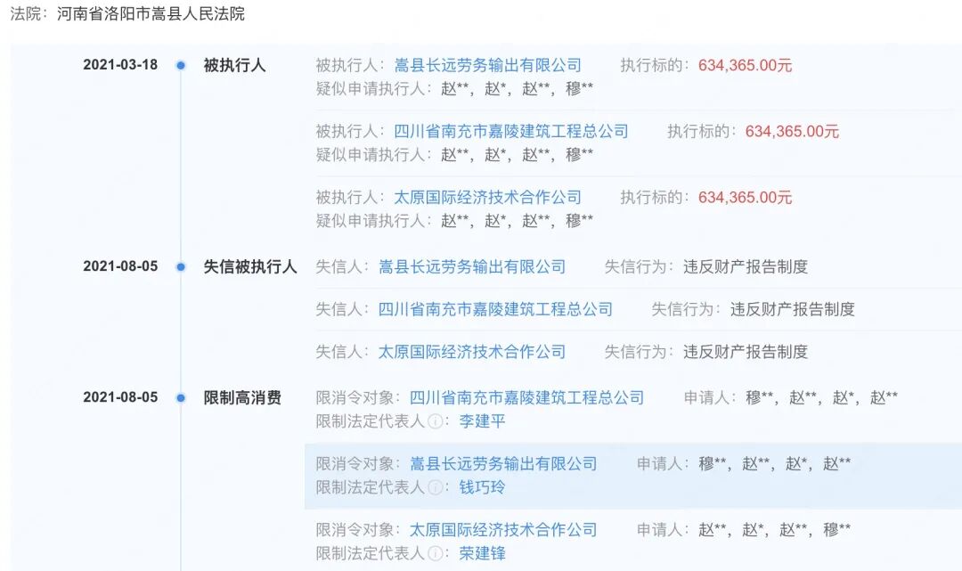此后,因太原国际经济技术合作公司未按执行通知书指定的期间履行生效法律文书确定的给付义务,嵩县人民法院于2021年8月向其发布限制消费令,依照相关法律规定,对该公司采取限制消费措施,限制该单位及其法定代表人荣建锋不得实施高消费及非生活和工作必需的消费行为。