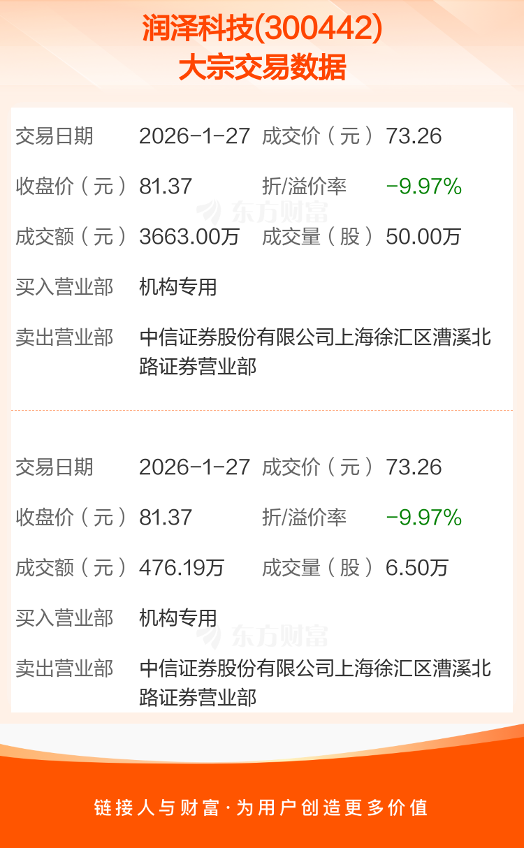 2026年1月27日,润泽科技发生2笔大宗交易,共成交56.50万股,成交金额4139.19万元,占其流通市值比例为0.03%。