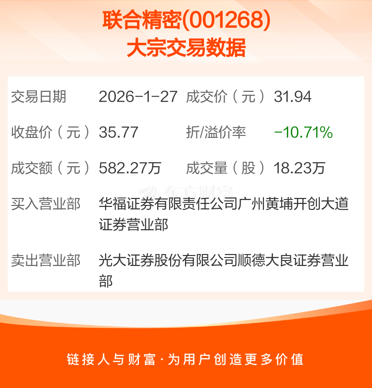 2026年1月27日,联合精密发生1笔大宗交易,共成交18.23万股,成交金额582.27万元,占其流通市值比例为0.26%。