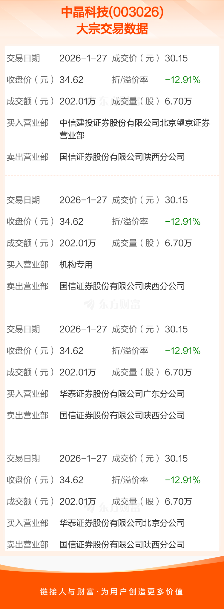 2026年1月27日,中晶科技发生4笔大宗交易,共成交26.80万股,成交金额808.04万元,占其流通市值比例为0.24%。