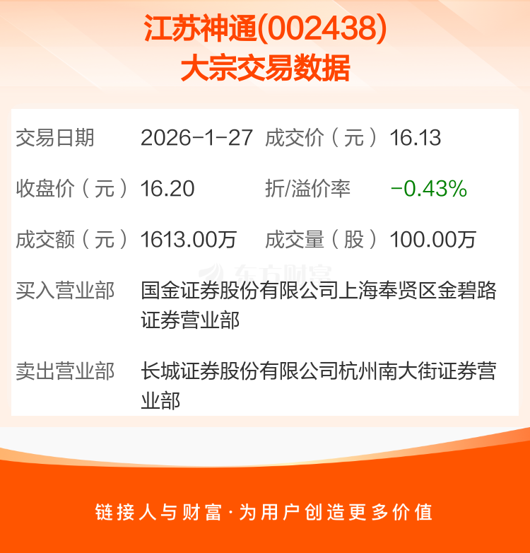 2026年1月27日,江苏神通发生1笔大宗交易,共成交100.00万股,成交金额1613.00万元,占其流通市值比例为0.21%。