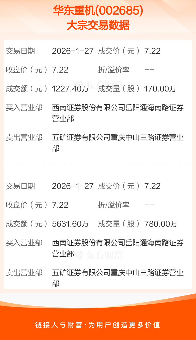 2026年1月27日,华东重机发生2笔大宗交易,共成交950.00万股,成交金额6859.00万元,占其流通市值比例为0.94%。