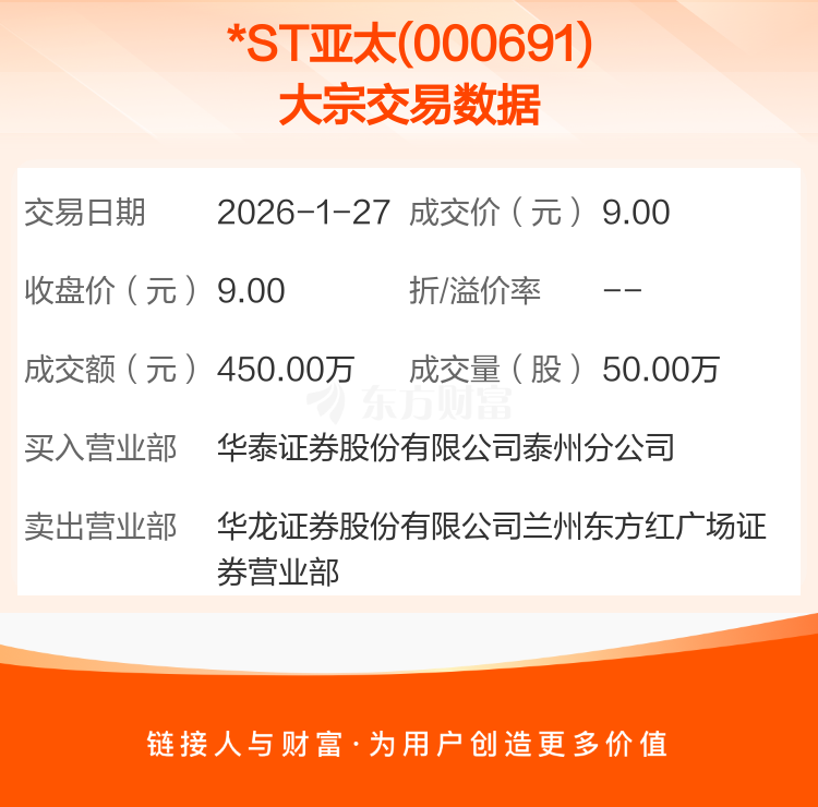 2026年1月27日,*ST亚太发生1笔大宗交易,共成交50.00万股,成交金额450.00万元,占其流通市值比例为0.15%。