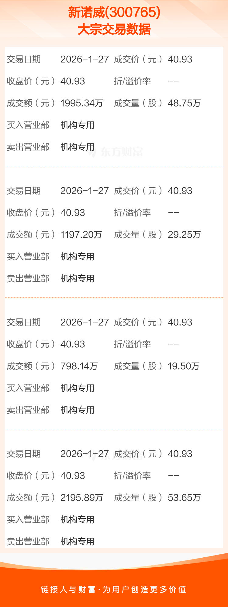 2026年1月27日,新诺威发生4笔大宗交易,共成交151.15万股,成交金额6186.57万元,占其流通市值比例为0.11%。