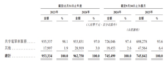 招股书显示,共享电单车服务是松果出行的营收绝对主力,2023年、2024年该业务分别贡献98.1%、97%的营收,2025年前三季度占比虽降至93.6%,但仍占据主导地位。2025年前三季度,共享电单车服务营收为6.98亿元,较上年同期的7.26亿元同比下降3.8%,公司在招股书中解释,这主要是由于退出了部分营运回报较低的市县市场,进行战略优化调整。