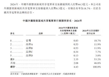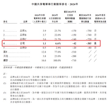 根据灼识咨询报告,按2024年交易额计算,松果出行为中国外围发展区域(下沉市场)最大的共享电单车服务运营商,市占率达18.7%,位居首位;但在全国整体市场中,其市占率仅为6.6%,位居第四,落后于哈啰出行(23.7%)、美团单车(22%)和青桔单车(21.7%),三大巨头合计市占率超60%,竞争差距显著。