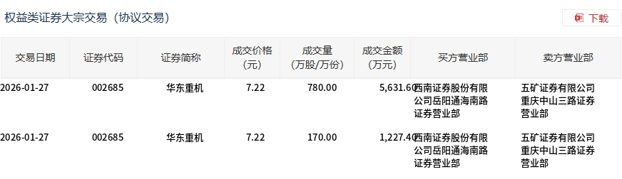 华东重机今日大宗交易平价成交950万股,成交额6859万元
