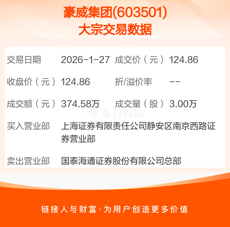 大宗交易:豪威集团成交374.58万元(1-27)