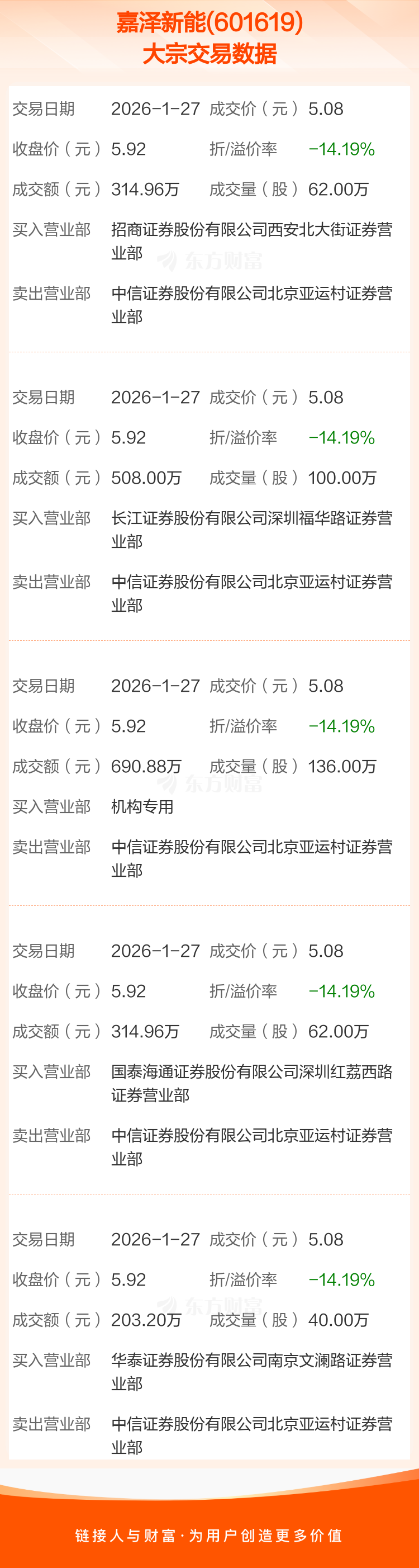2026年1月27日,嘉泽新能发生5笔大宗交易,共成交400.00万股,成交金额2032.00万元,占其流通市值比例为0.14%。