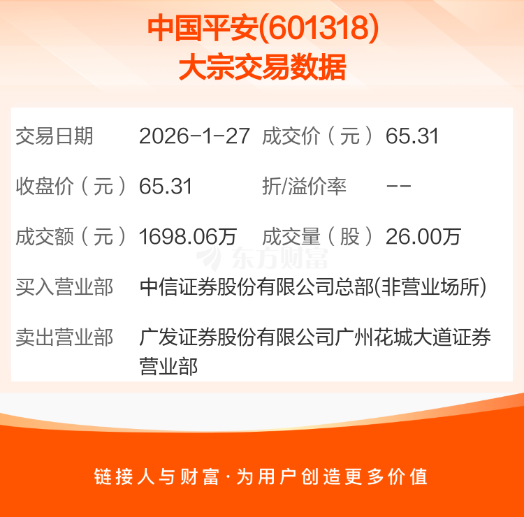 2026年1月27日,中国平安发生1笔大宗交易,共成交26.00万股,成交金额1698.06万元。