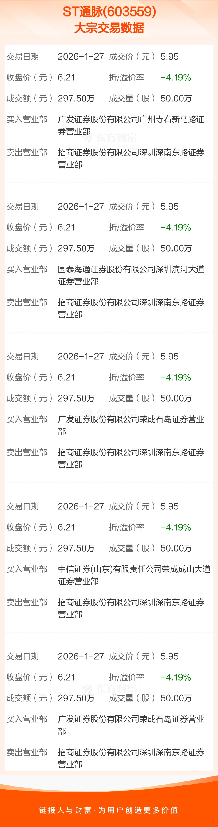 2026年1月27日,ST通脉发生5笔大宗交易,共成交250.00万股,成交金额1487.50万元,占其流通市值比例为0.60%。
